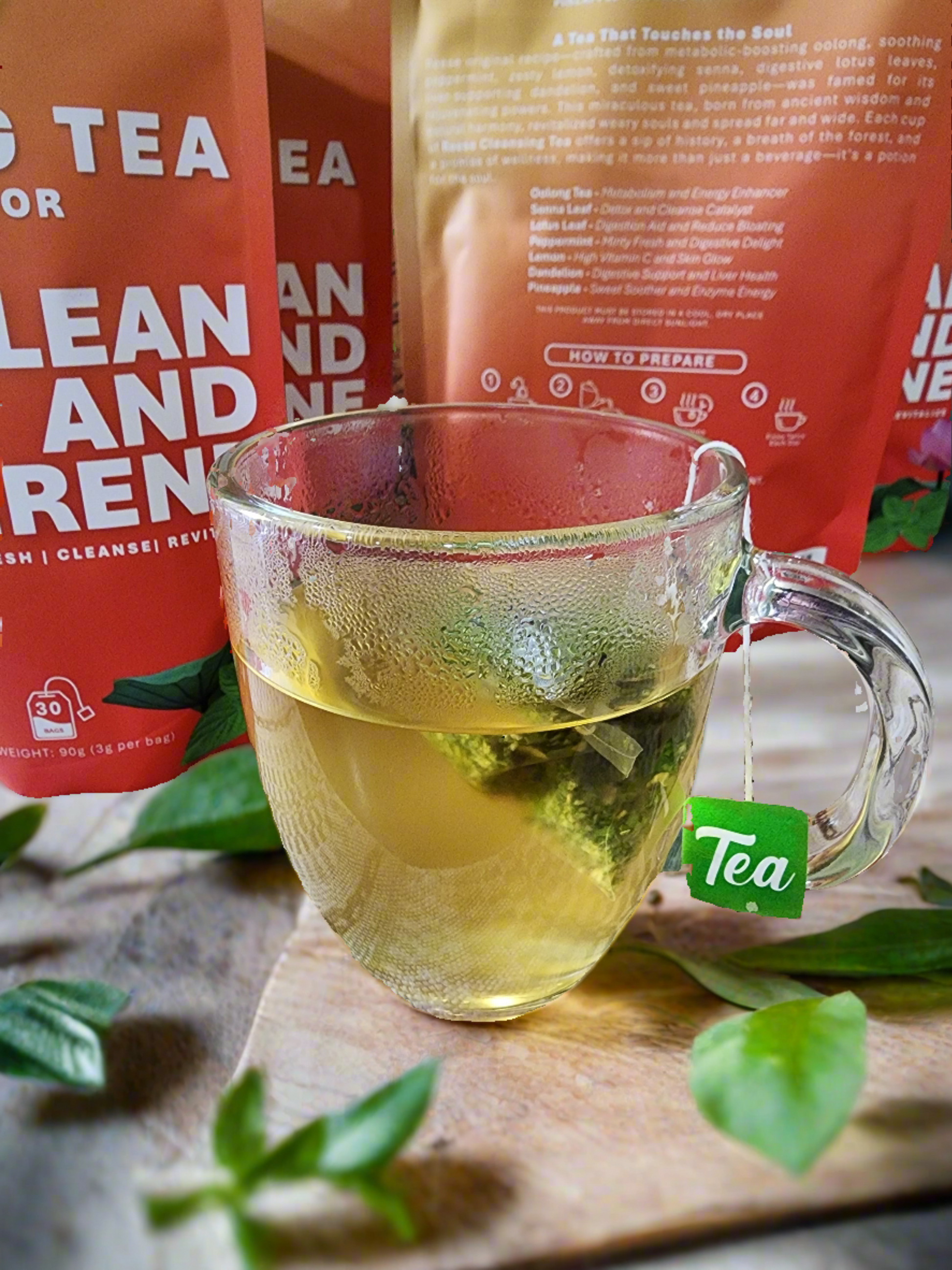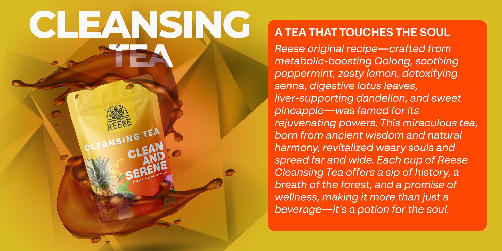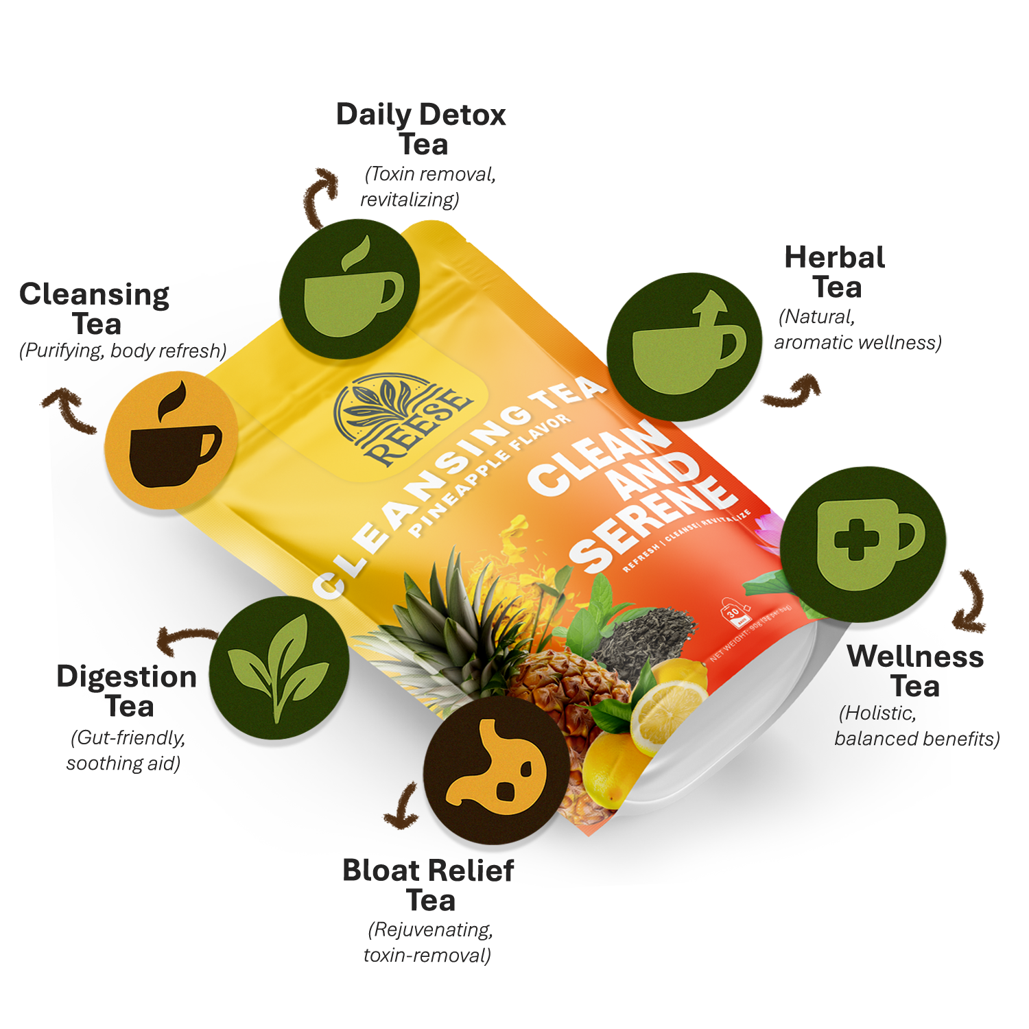 Reese Cleansing Tea blends ancient herbal wisdom with feel-good flavor for a refreshing ritual your body will thank you for. Each cup combines metabolism-boosting oolong, digestive lotus leaf, detoxifying senna, and soothing peppermint — all harmonized with zesty lemon, sweet pineapple, and liver-supporting dandelion.